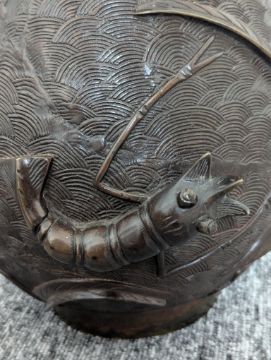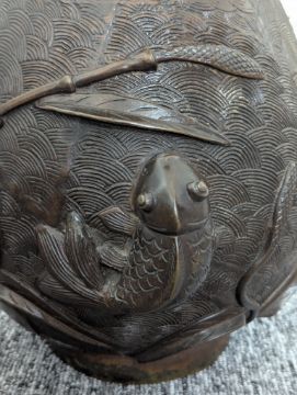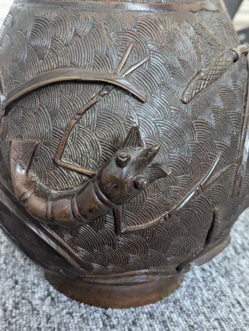 20th century, the circular rim with a Greek key border, leading to a waisted neck decorated with cherry blossom, the handles modelled as branches, leading to a bulbous body depicting koi and shrimp