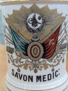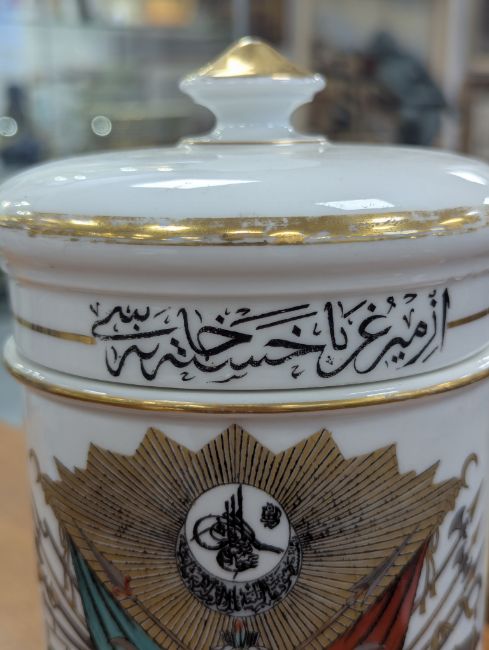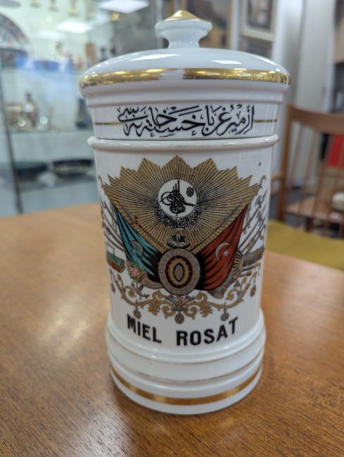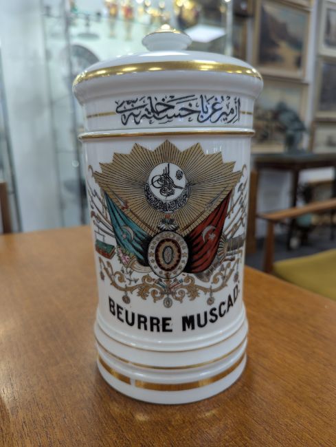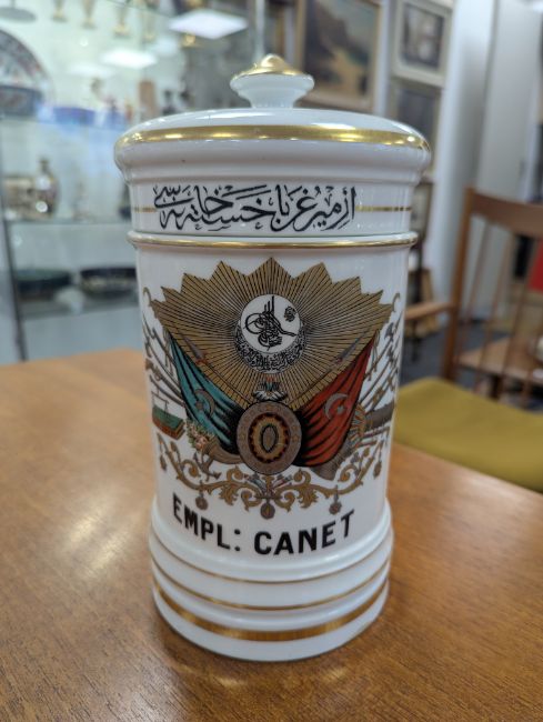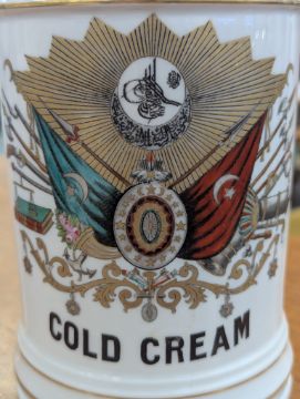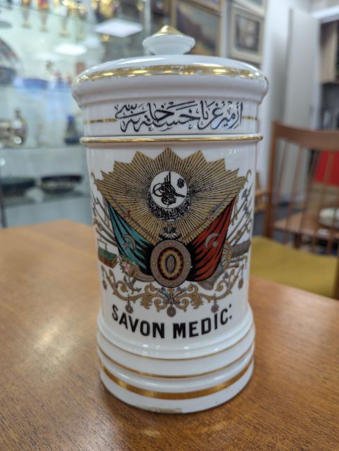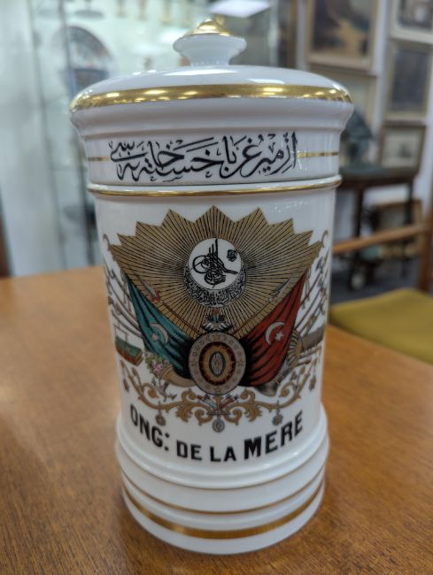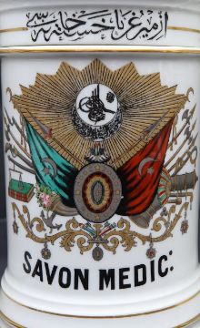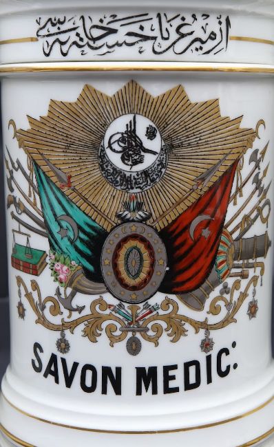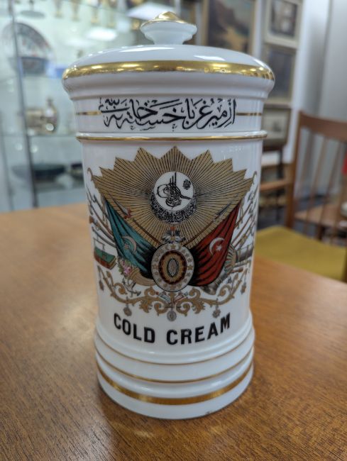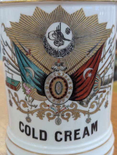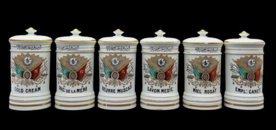late 19th to early 20th century, Turkish, the lids with gilt borders and Arabic inscriptions, the cylindrical bodies depicting the Ottoman Empire coat of arms, above French and English labels comprising 'ONG: DE LA MARE', 'COLD CREAM', MIEL ROAST', EMPL:CANET', 'SAVON MEDIC', and 'BEURRE MUSCAD' (6)