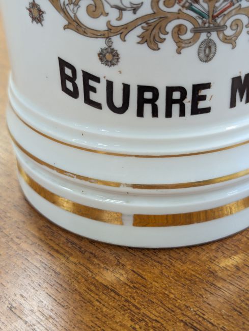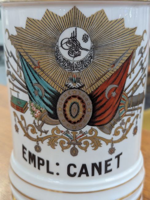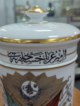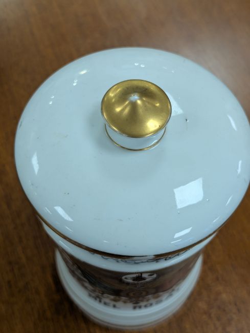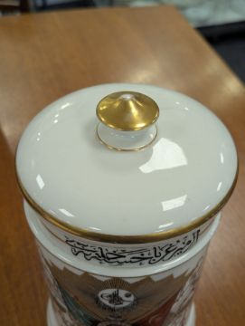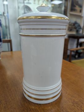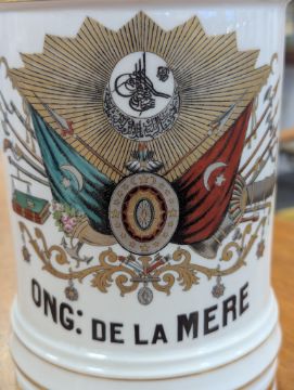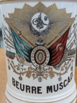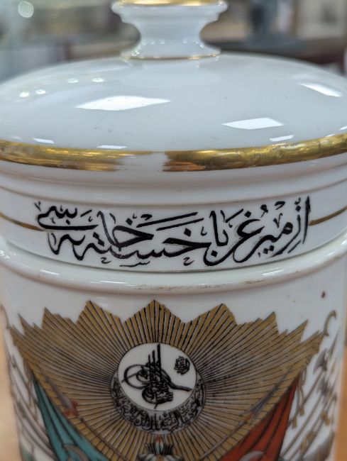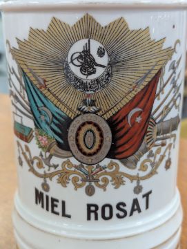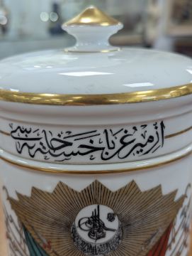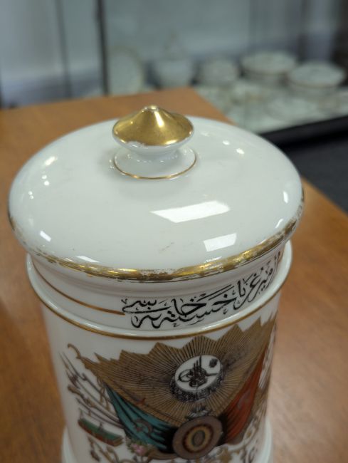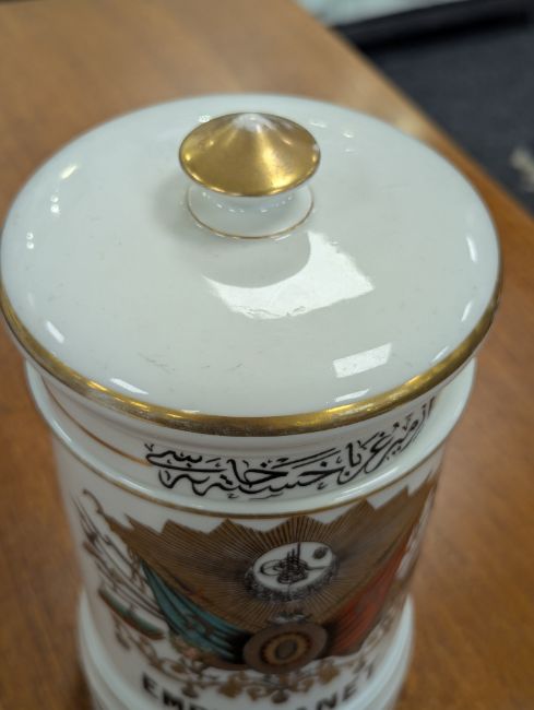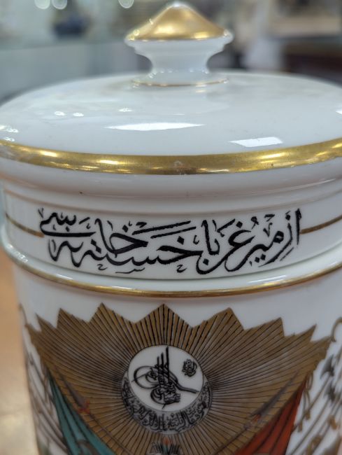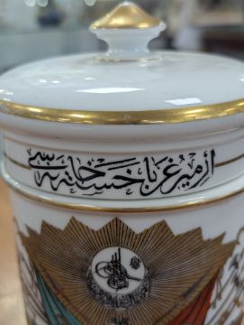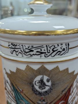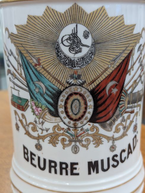 late 19th to early 20th century, Turkish, the lids with gilt borders and Arabic inscriptions, the cylindrical bodies depicting the Ottoman Empire coat of arms, above French and English labels comprising 'ONG: DE LA MARE', 'COLD CREAM', MIEL ROAST', EMPL:CANET', 'SAVON MEDIC', and 'BEURRE MUSCAD' (6)