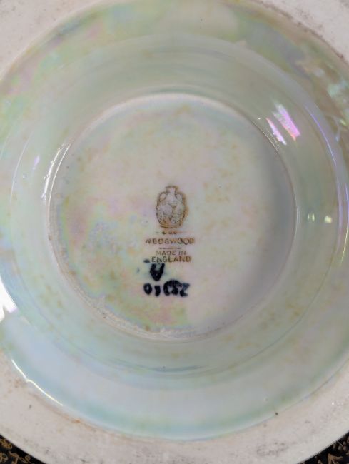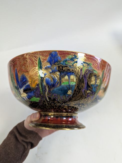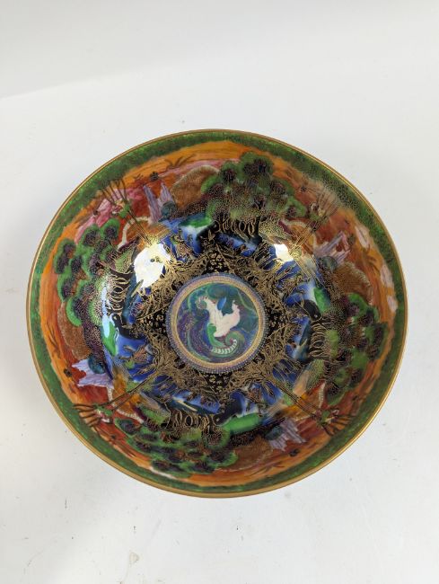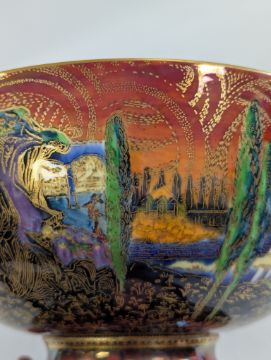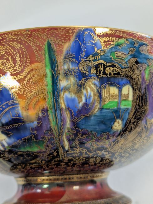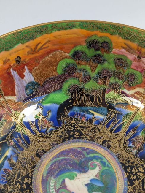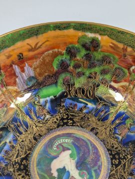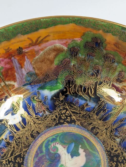 c.1925-30, of pedestal form, the exterior decorated with gilt and green popular trees to a flame orange lustre sky, the interior in the 'Woodland Bridge' and 'Elves V' pattern, the centre roundel depicting a mermaid, printed Wedgwood mark to the base, painted no. Z5360
