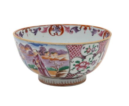 19th century, decorated in the Mandarin palette, with three figures before a mountainous landscape and pagoda, between floral panels, the base with a Gerald Bushell Collection paper label