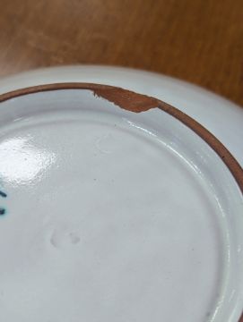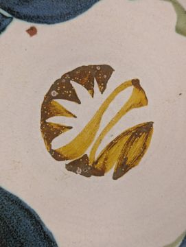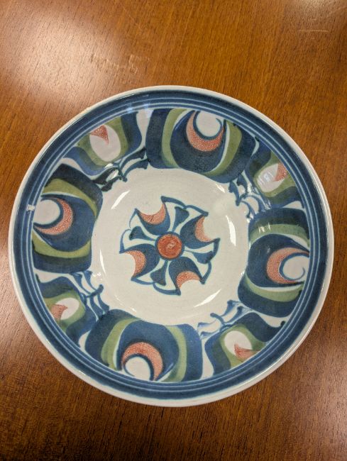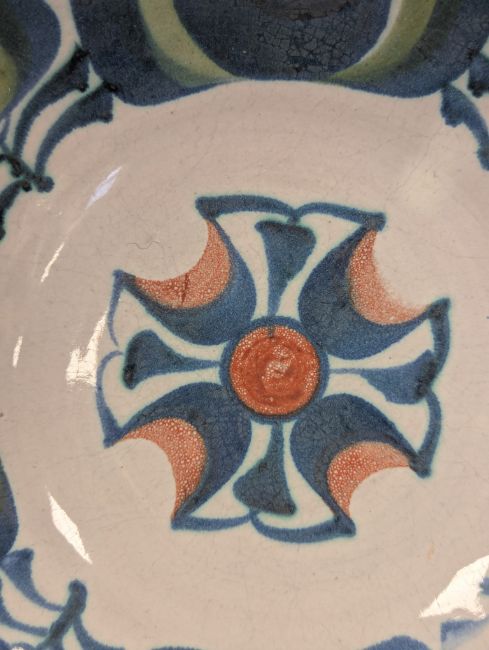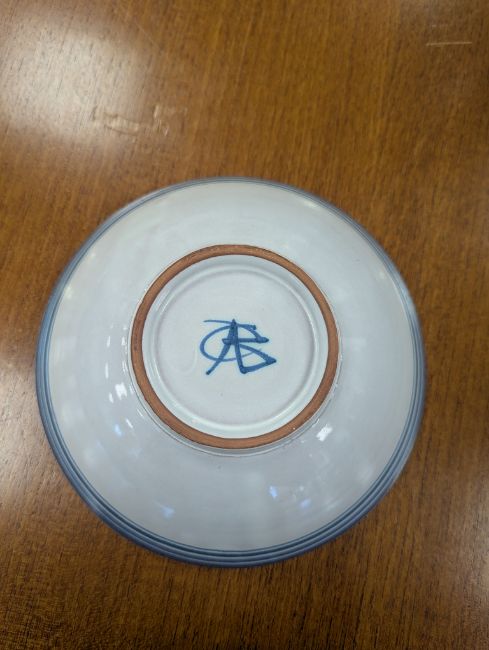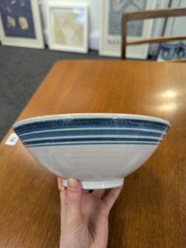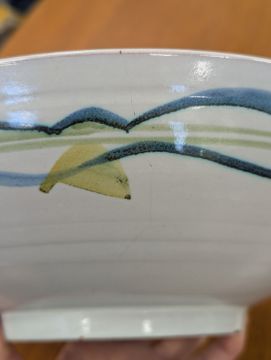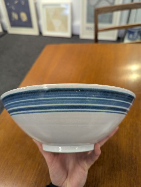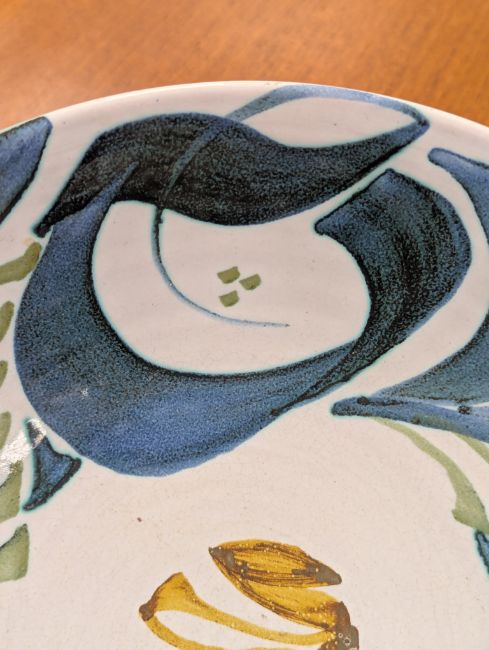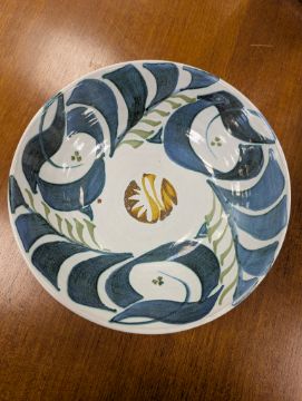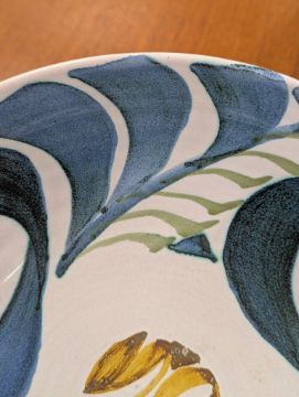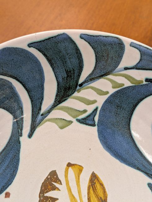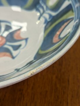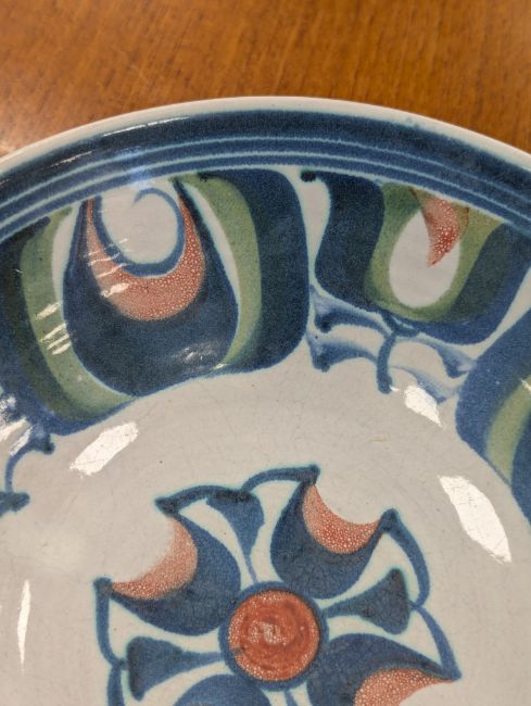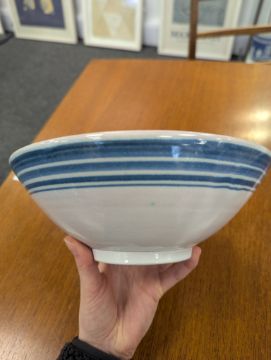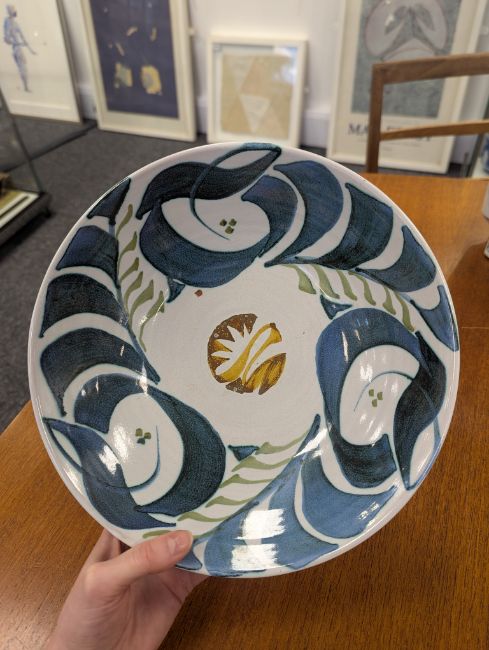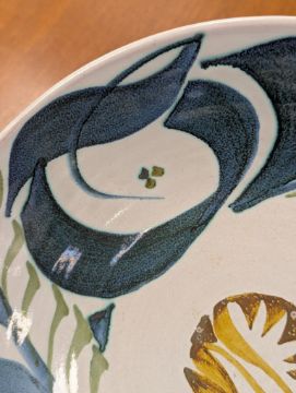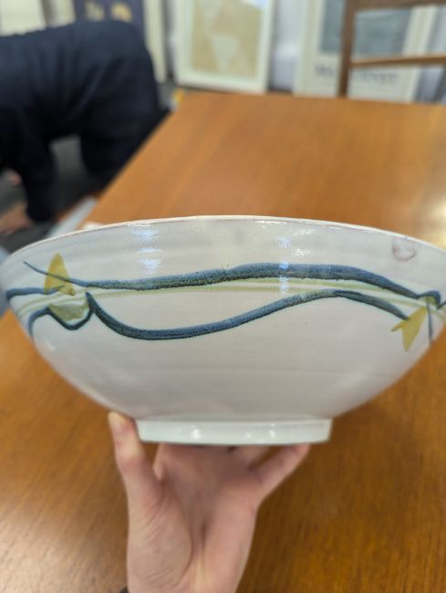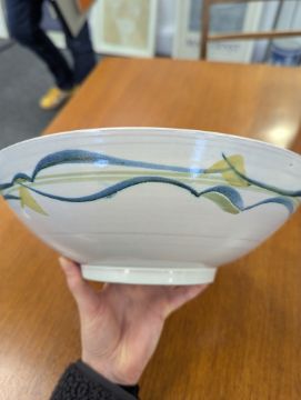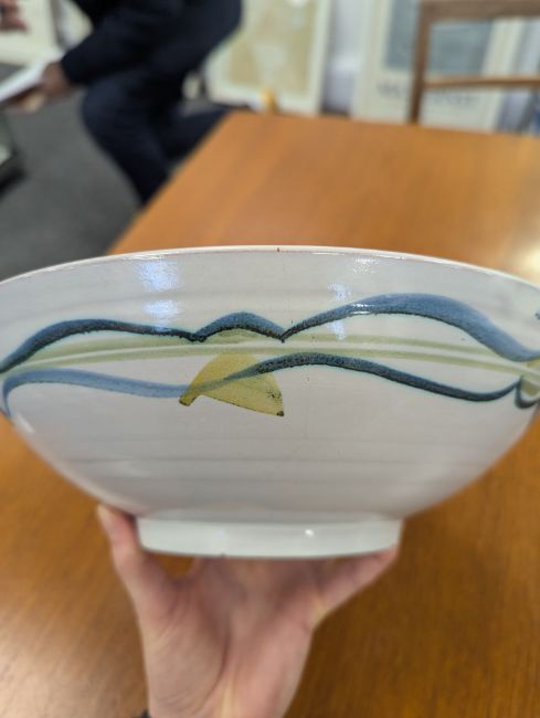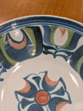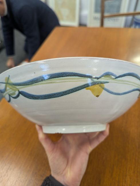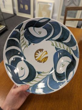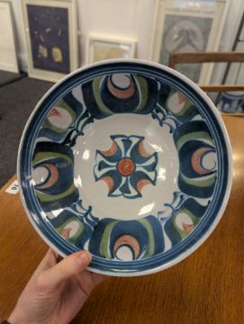 Two Aldermaston Pottery bowlsby Catherine Bennett (active 1971-81), tin glazed and decorated with stylised foliate and floral motifs, signed to the base (2)diameter 22 and 26cmCondition: The larger example with a chip to the foot rim, a hairline crack and chips to the glaze. Provenance: From a private collection. Gifted to the vendor by the artists when she lived in the potters' cottages at Aldermaston.
