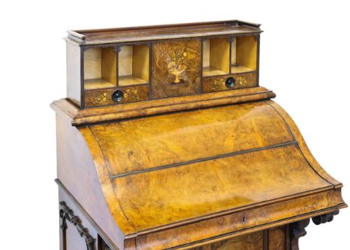 with a lift-up top containing four compartments above two drawers, marquetry inlaid with a flower laden vase, the piano-top opening to reveal two drawers, an arrangement of brass capped inkwells, and a slide out tooled burgundy leather writing surface, with hidden compartment, raised on scrolled supports, each side with a door, one containing four drawers, the other with two shelves