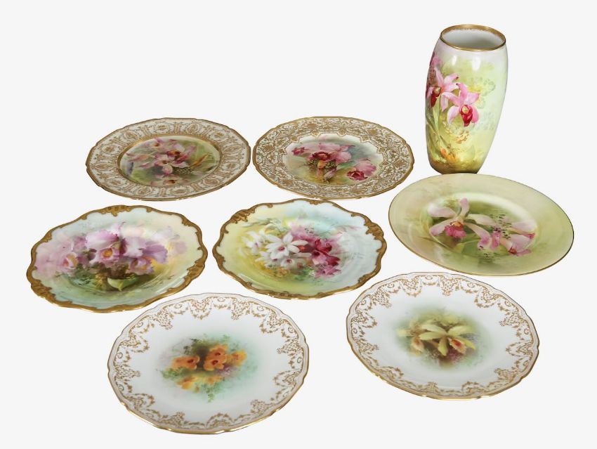 A group of seven Royal Doulton porcelain plates, and a Royal Doulton vase,early 20th century, all with a hand-painted floral decoration, comprising four by David Dewsberry, titled 'Cattleya Tirana', 'Varieties Calanthe', 'Dendrodium', and 'Cattleya Var', two by Charles Hart, titled 'Dendrobium Wardianum' and 'Laelia Prestans', and another titled 'Cattleya Vie Regina', together with a vase painted with orchids, printed marks (8)the largest plate diameter 26cmvase height 22cmCondition: Crazing throughout.