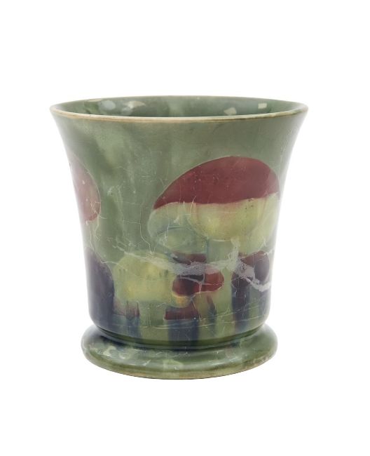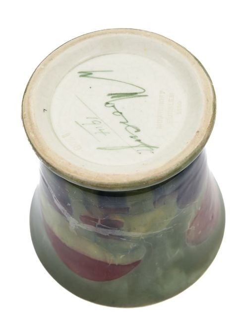 early 20th century, with a flared rim, decorated with mushrooms to a pale green ground, painted signature, dated 1914, impressed 'Moorcroft Burselm 1914', no. 1398