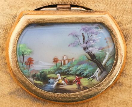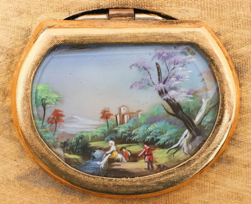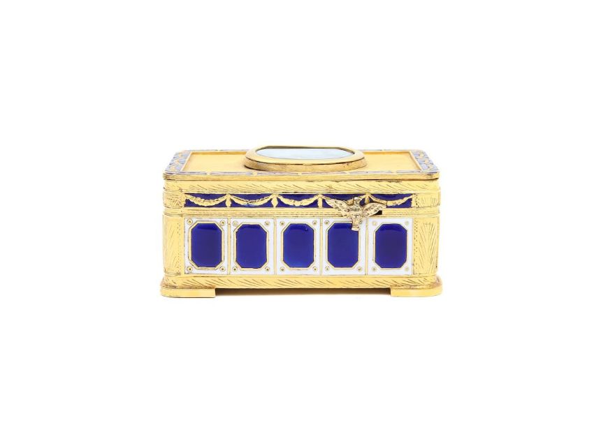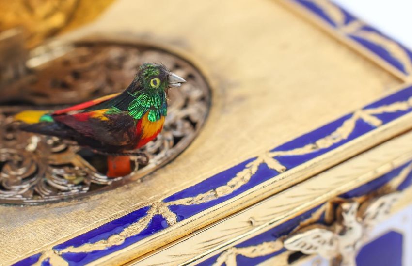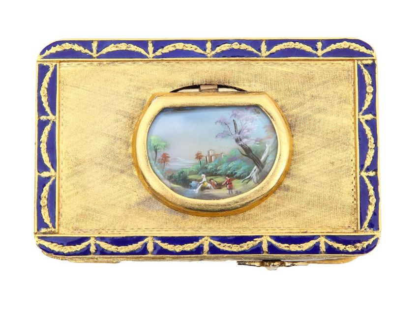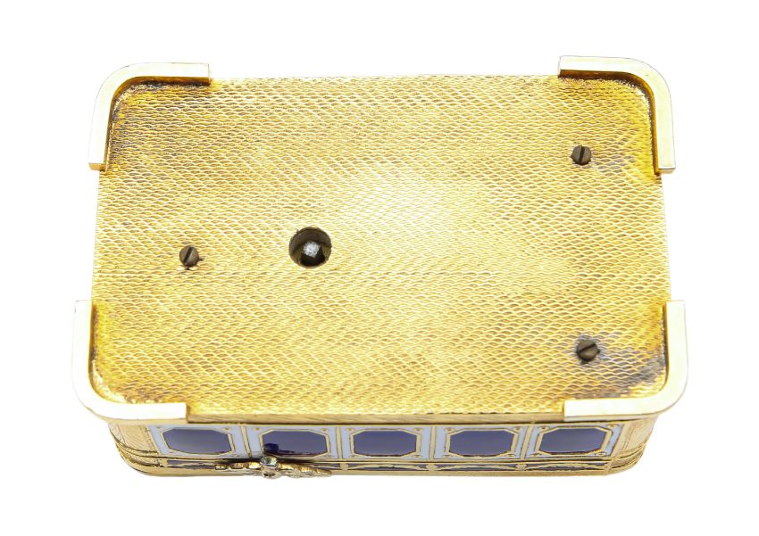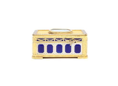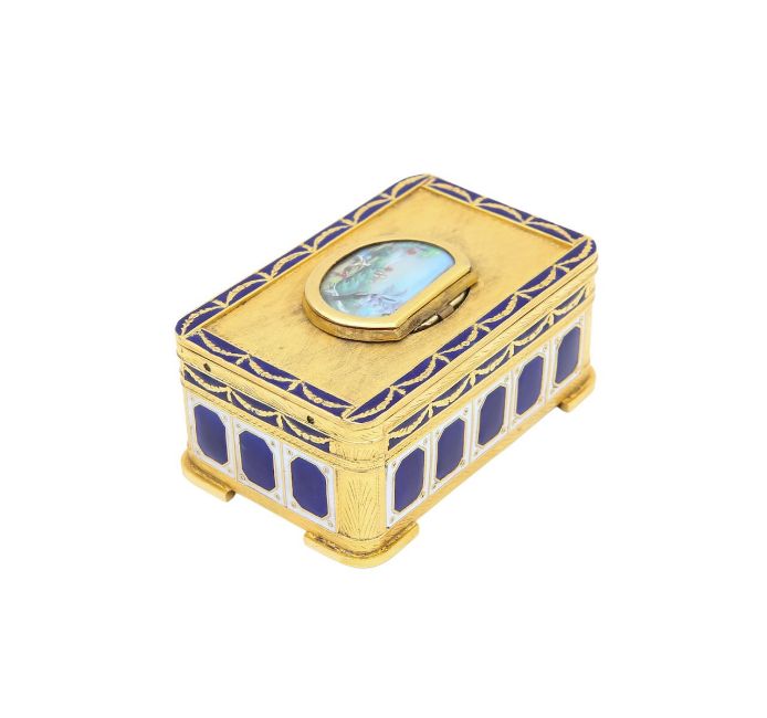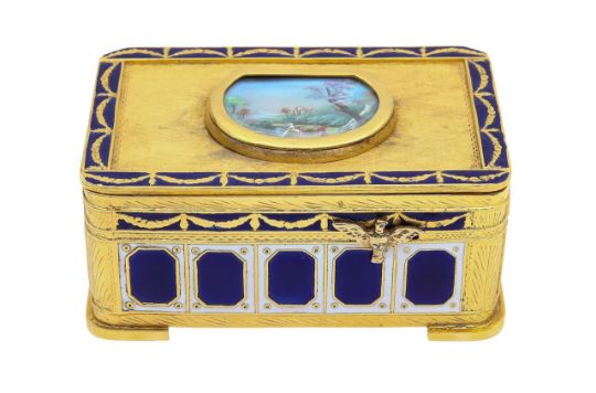 mid 20th century, the gilt top with a cobalt blue enamelled border of garlands, the centre compartment with painted figures in a tree-lined landscape, housing a small feathered bird revealed using the front push slide, in the form of a bird with outstretched wings, the sides with enamelled blue and white panels, the underside with central winder, and key