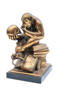 modelled after Rodin's 'The Thinker', holding a compass with its toes, and pondering a human skull, whilst sat on a pile of books titled 'Darwin', inscribed 'Eritis Sicut Deus', raised on a black veined marble base, unsigned