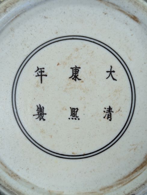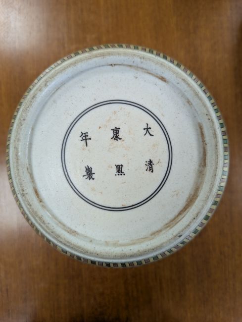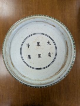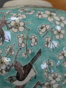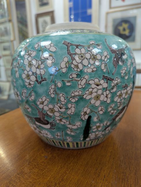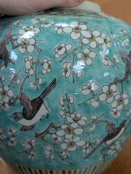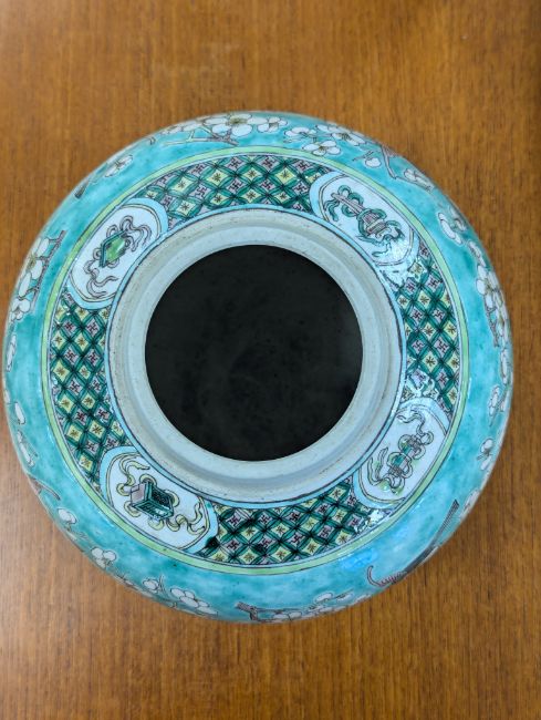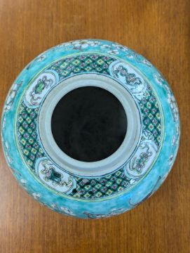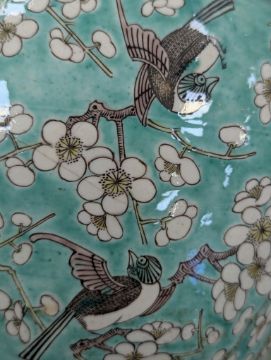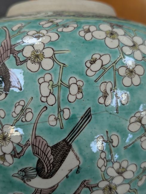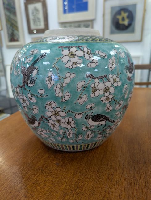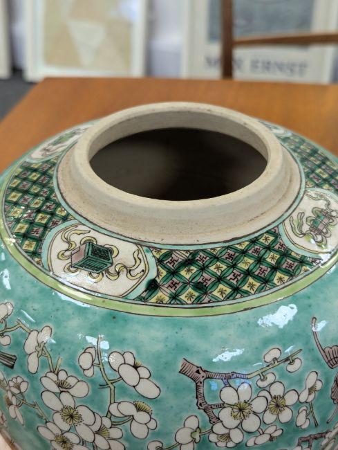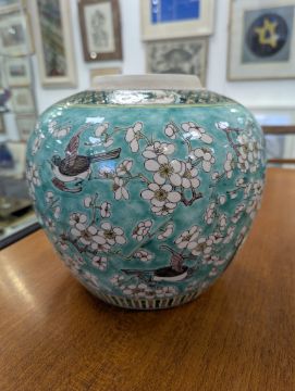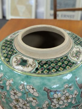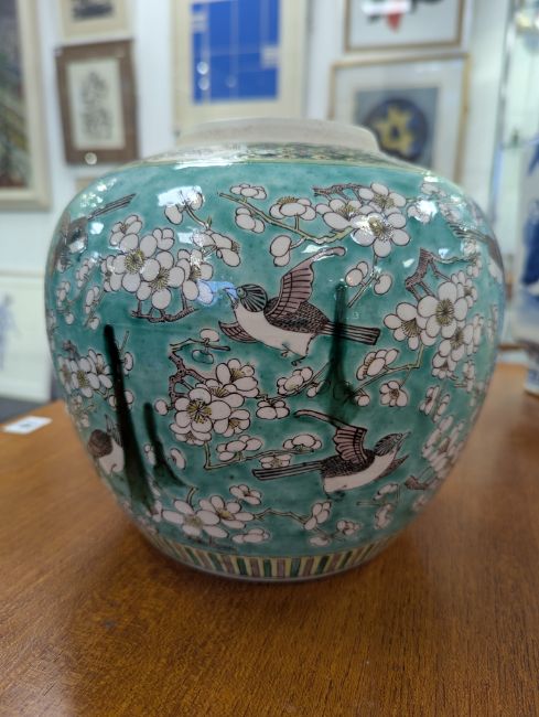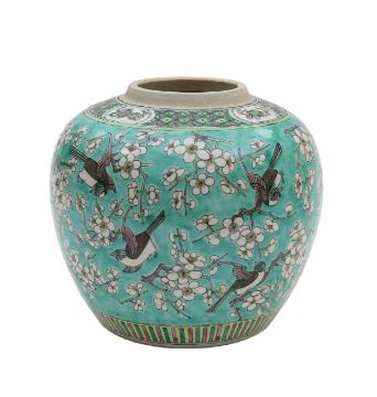 19th century, the rim decorated with precious objects, to a patterned border, the bulbous body enamelled with birds amongst blossoming prunus branches, to a green ground, six character Kangxi type mark to the base, 大清康熙年製