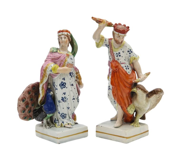 A pair of Staffordshire pottery figures of Jupiter and Junoc.1820, Jupiter modelled holding a lightning bolt, standing next to an eagle, and Juno modelled next to a peacock (2)the largest height 16cmCondition: Jupiter with restoration around the head, neck, hands and lightning bolts. Chips to the crown. Juno with restoration through the head, the cloak and the hand. Chips to the staff.