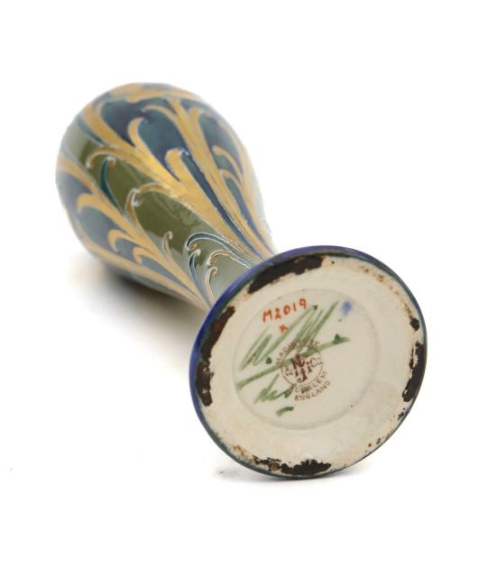c.1905, designed by William Moorcroft, of shouldered form, leading to a tapering stem, on a circular base, printed mark, painted signature and numbered M2019