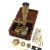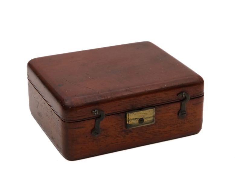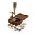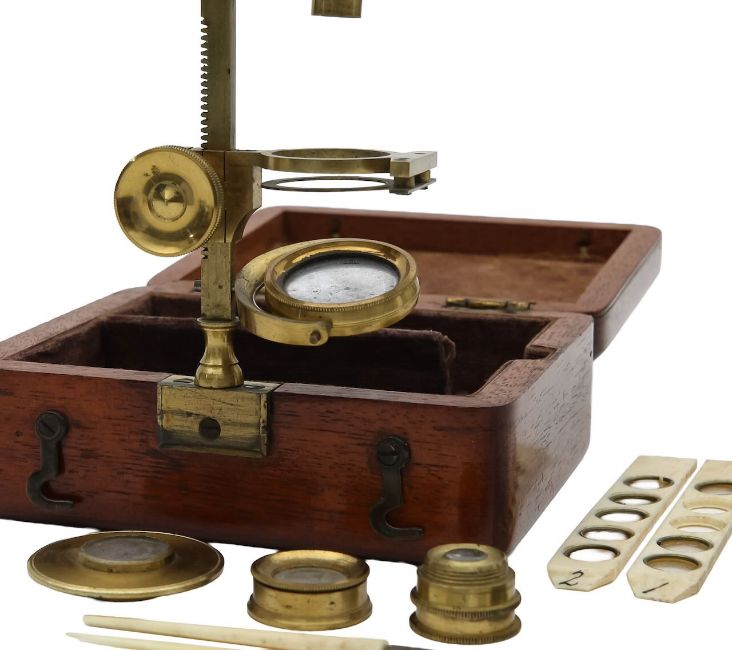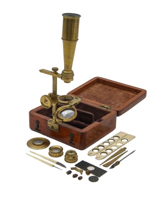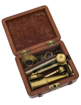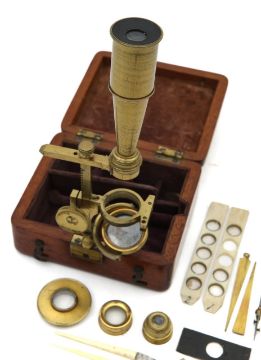 A Gould-type portable microscopeearly 19th century, the brass body tube with three numbered objectives mounted on a brass bar with adjustable stage, substage mirror, screwing into mahogany case, with two ivory specimen slides and stage scapels and forcepswidth of case 10cm height of body tube approx 9cmCondition: In fair condition. Wear commensurate with age.IMPORTANT NOTEThis item has been registered as exempt from the UK Ivory Act 2018.  Ivory declaration submission number reference: Q3GHGVEV