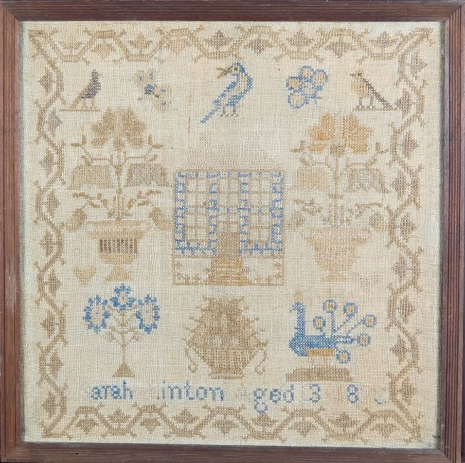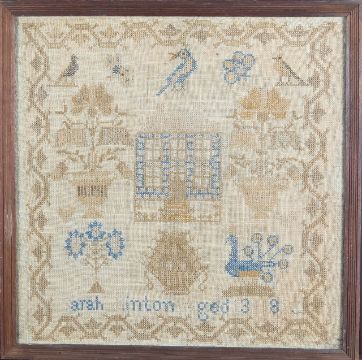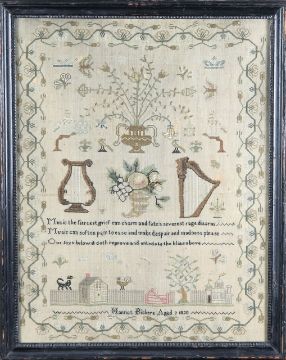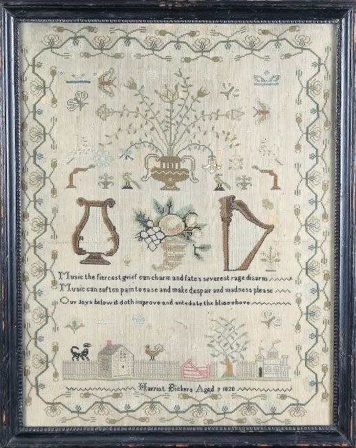 A George III needlework and a Victorian woolwork sampler,the George III example by Harriot Bickers, aged 9, 1820, depicting a flower-laden vase, above a cornucopia, flanked by two harps, above lines from Alexander Pope's poem 'Ode to Cecilia's Day', and a pastoral scene of a cat and chicken standing on a fence, between a cottage and castle, all within a foliate border, the Victorian example by Sarah Hinton, aged 13, 1892, depicting a central house, flanked by two flower-laden vases, above a peacock and tree (2)framed and glazed 47 x 37cm, and 44 x 43cmCondition: George III sampler) Several holes, stains and discolouration. Locks to the frame. Victorian sampler) Heavily discoloured and faded. No large holes. Wear to the frames.
