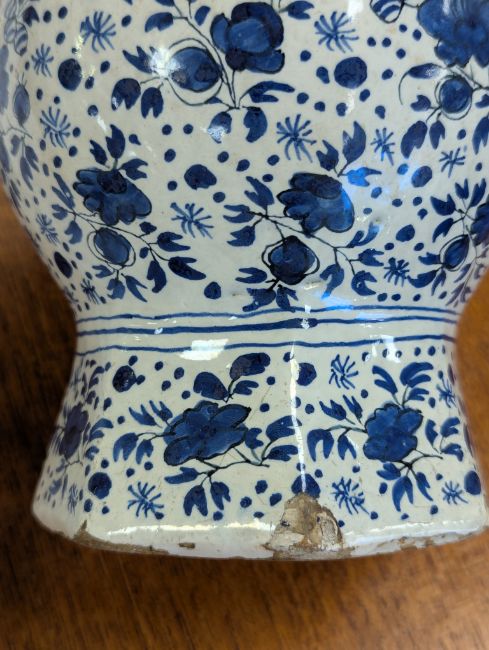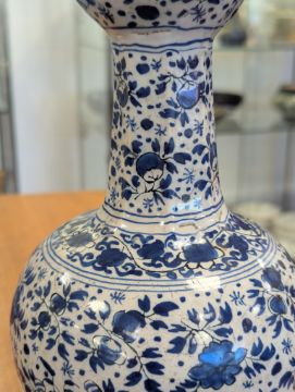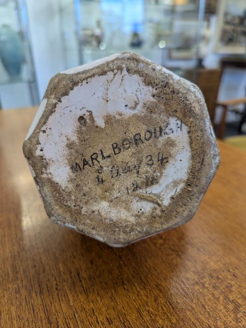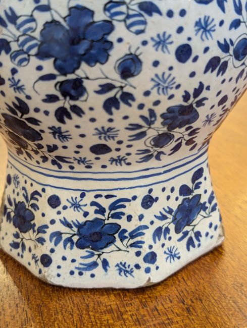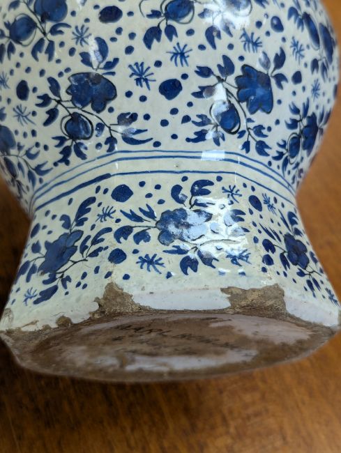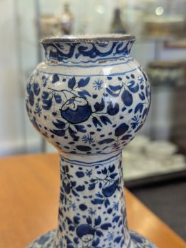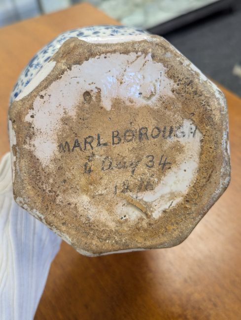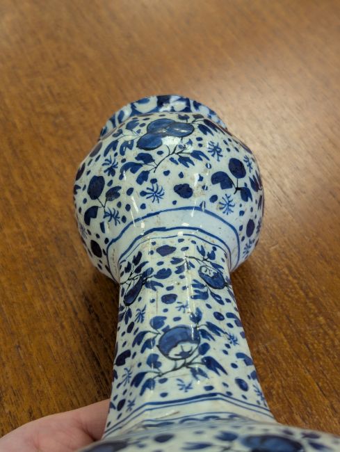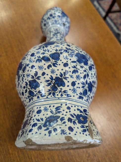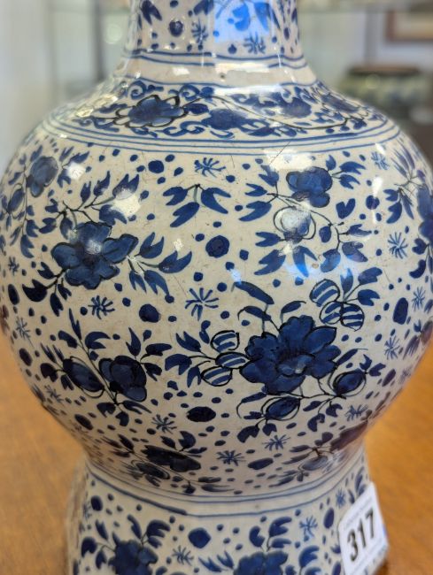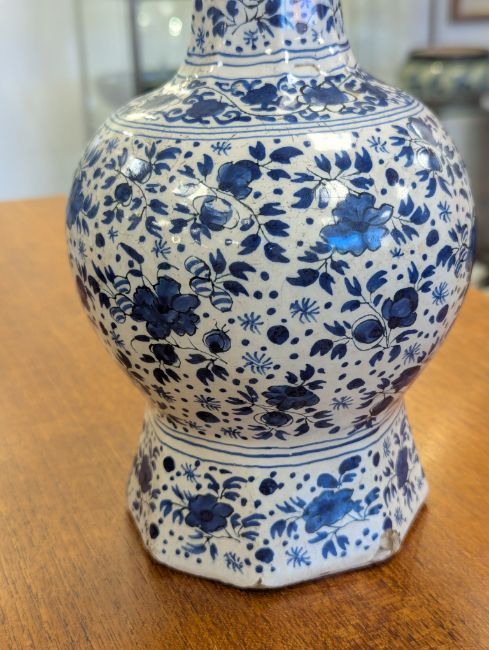 late 18th/early 19th century, everted rim, knopped neck, octagonal faceted stem, bulbous body, flared octagonal base, hand painted with all over floral decoration within borders, inscribed to base 'Marlborough 4th Aug 34'