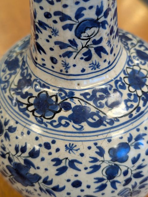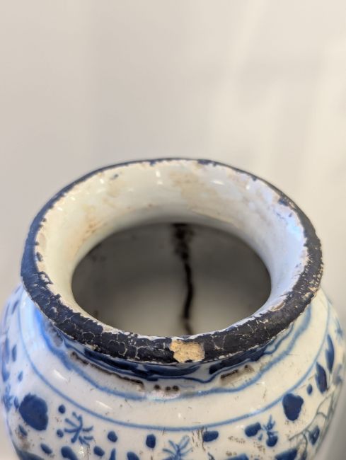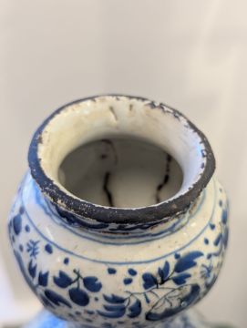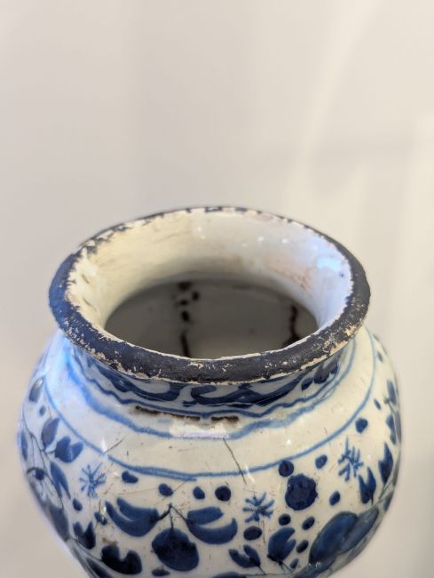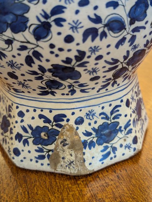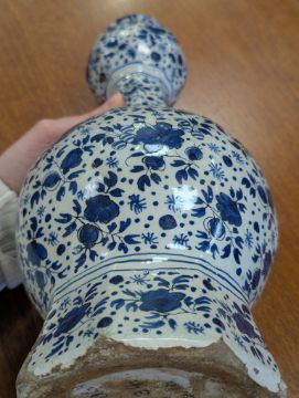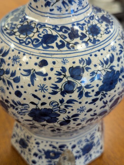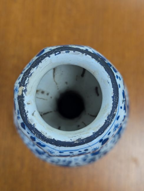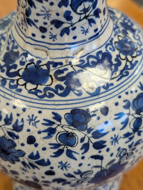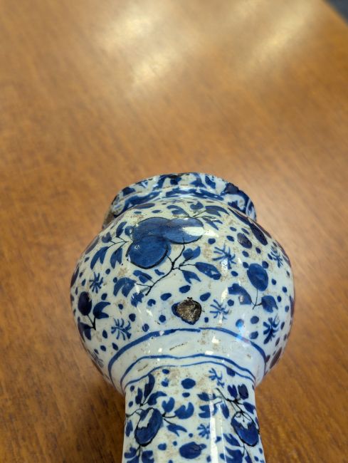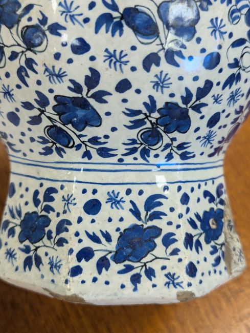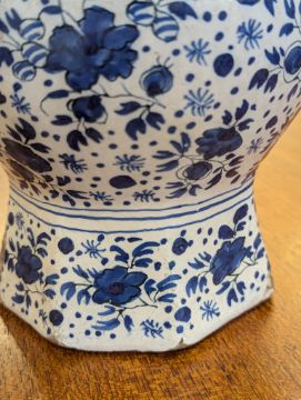 late 18th/early 19th century, everted rim, knopped neck, octagonal faceted stem, bulbous body, flared octagonal base, hand painted with all over floral decoration within borders, inscribed to base 'Marlborough 4th Aug 34'