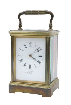 white enamel dial with Roman numerals, inscribed 'J.W. Benson, 25, Old Bond Street, London', single train movement, with winder, with carrying swing handle, plinth base