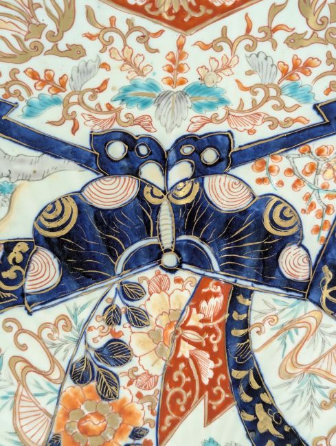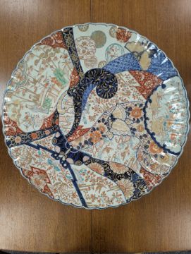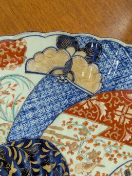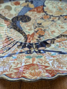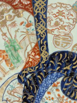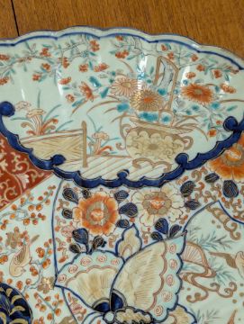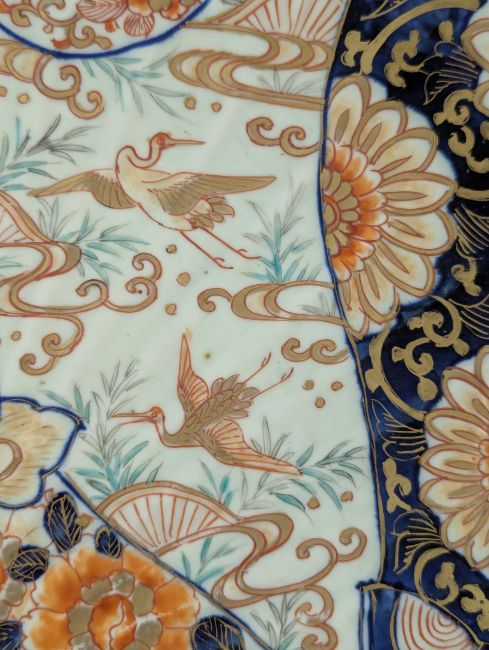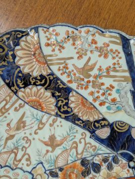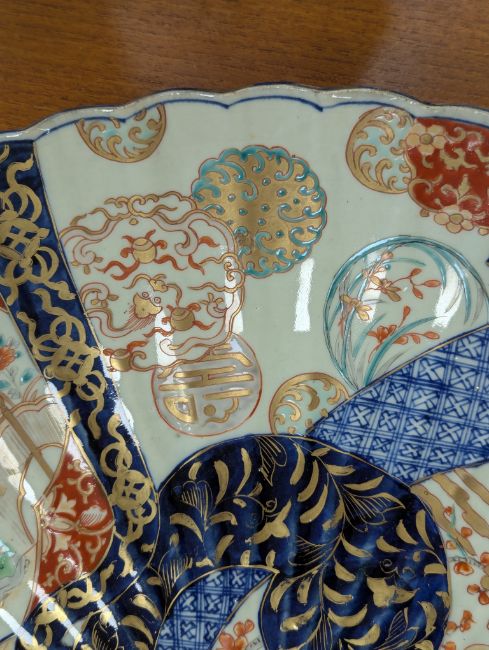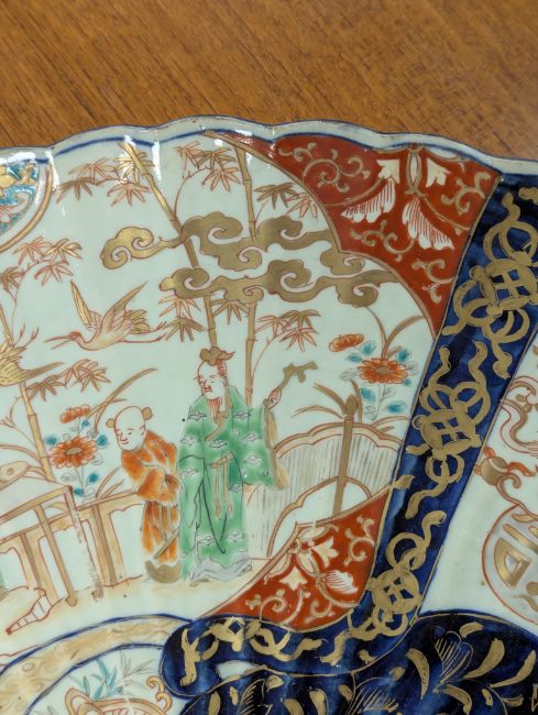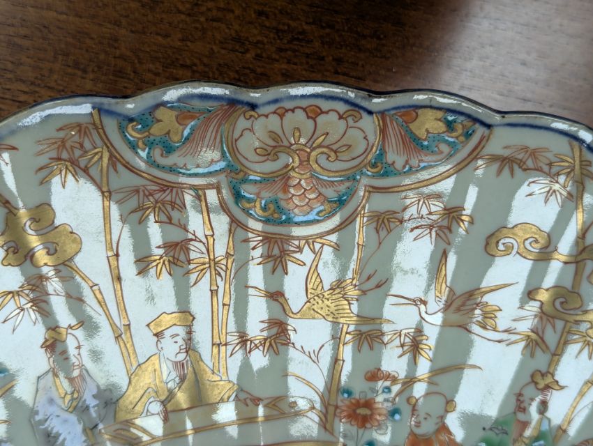 Meiji period, c.1900, of circular form, with a scalloped rim, the painted panels depicting scholarly figures, musicians, ho ho birds amongst flowering branches, cranes in flight, butterflies, and emblems