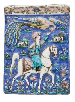 early 19th century, Tehran, Iran, the moulded and polychrome decoration depicting a scrolled foliate border, above an equestrian rider or horseman wearing a turban, with an outstretched arm feeding a phoenix, possibly the Persian mythological bird, Simurgh, before buildings, flowers and vegetation, to a cobalt blue ground