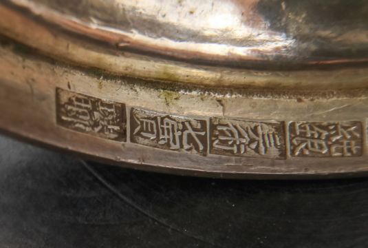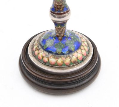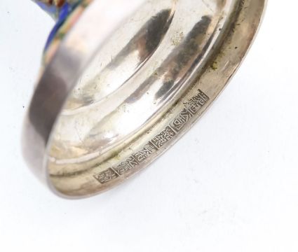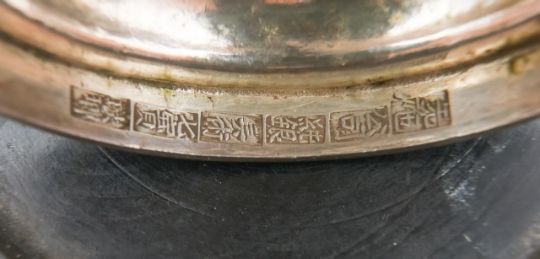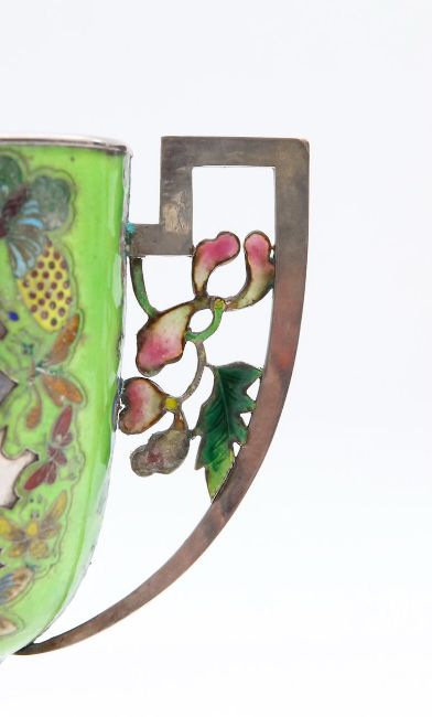 Condition: Rubbing and wear to the characters. Floods of solder around the handles on one side. In need of a clean. The enamel is largely intact, with minor losses, particularly around the handles and base. The cup does not fit snugly on the stand.