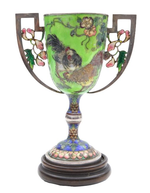 A Japanese silver and cloisonné twin-handled trophy cup,