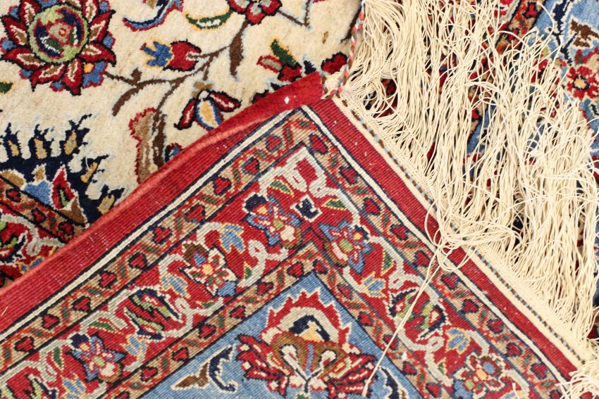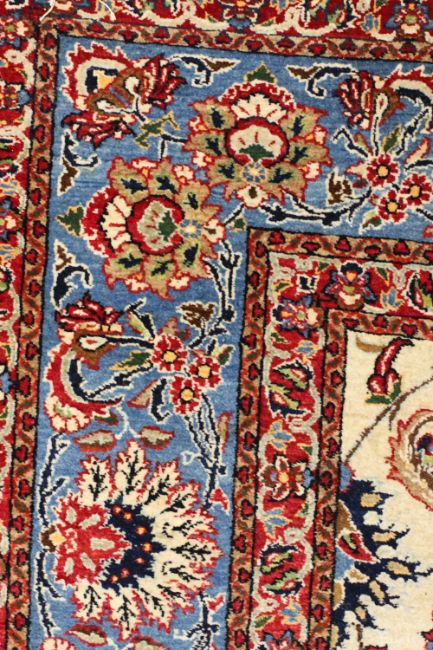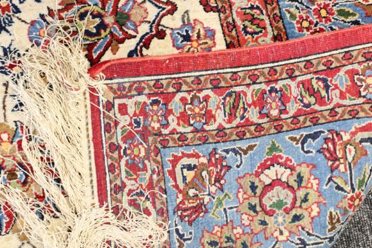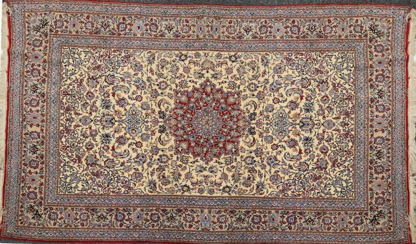 hand-knotted part silk, ivory field with central medallion, all-over herati foliate scroll decoration with floral motifs, within multiple borders