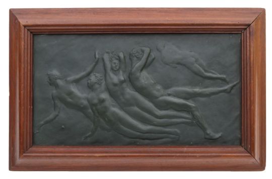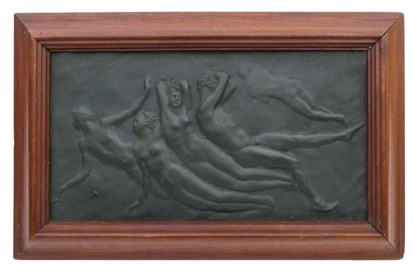 titled 'The Passing...', relief decorated with five Art Nouveau nude figures, unsigned, with a paper label to the reverse for picture frame maker Charles Henry West, 117 Finchley Road, London NW', exhibited in Doncaster 1934