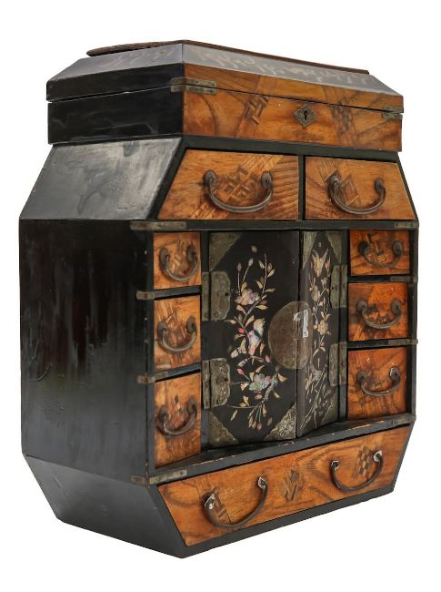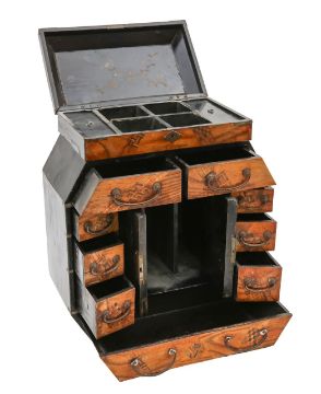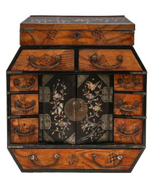 Meiji period (1868-1912), the hinged top opening to reveal six compartments, over two short drawers, the mother of pearl inlaid doors depicting birds amongst blossoming branches, with brass mounts, flanked by six drawers, above a further long drawer