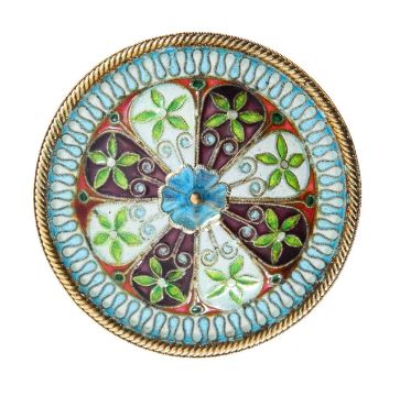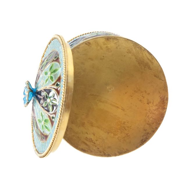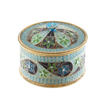 probably French, of circular form, the lid with intricate flower and scroll decoration and flower head finial, the sides with similar style plique-a-jour enamel decoration
