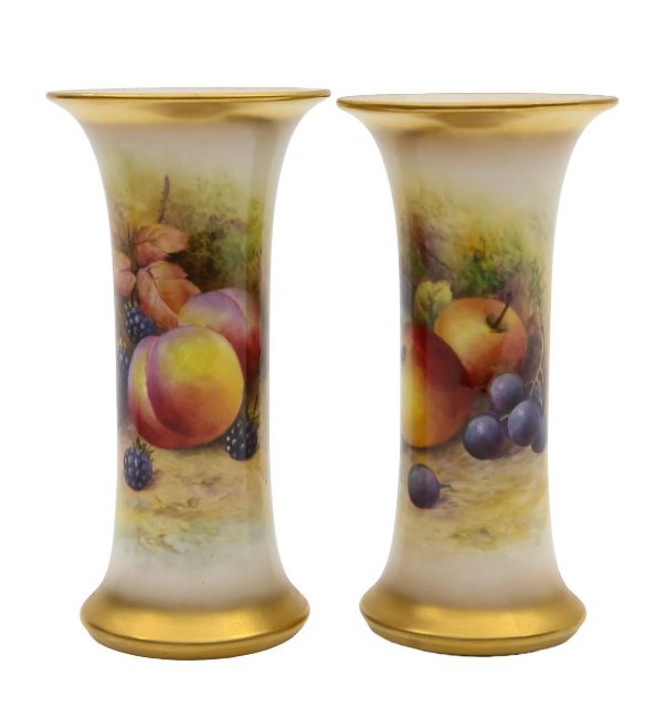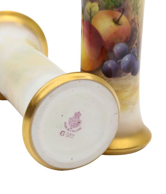 1931 date code, shape no. G923, with a flared rim, leading to a tapering cylindrical body, decorated by Thomas Lockyer, with apples, berries and autumnal leaves, to gilt rims and bases, printed marks (2)