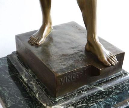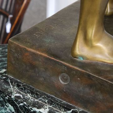 Condition: Large chip to the marble on the right hand corner. Small hairline crack around the wrist of the outstretched hand. Visible outline to the base around the rear foot. Pleasing patina.