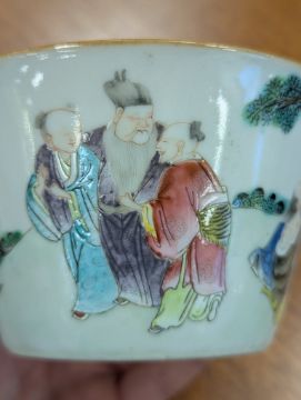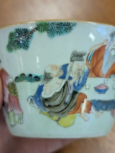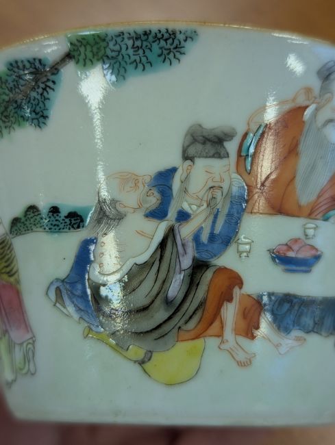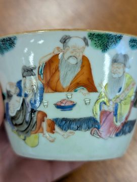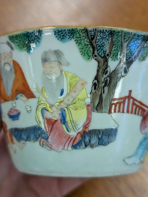 mid 19th century, of conical form, depicting a group of men seated at a table, drinking tea, one man picking his ear