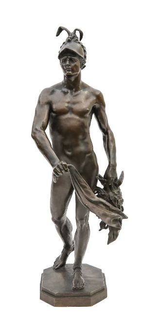 modelled nude, wearing a helmet adored with a dragon, holding flowing cloth, covering the face of Medusa, signed 'G. Simonds Sc.', cast by Singer & Sons, Frome, dated 1898