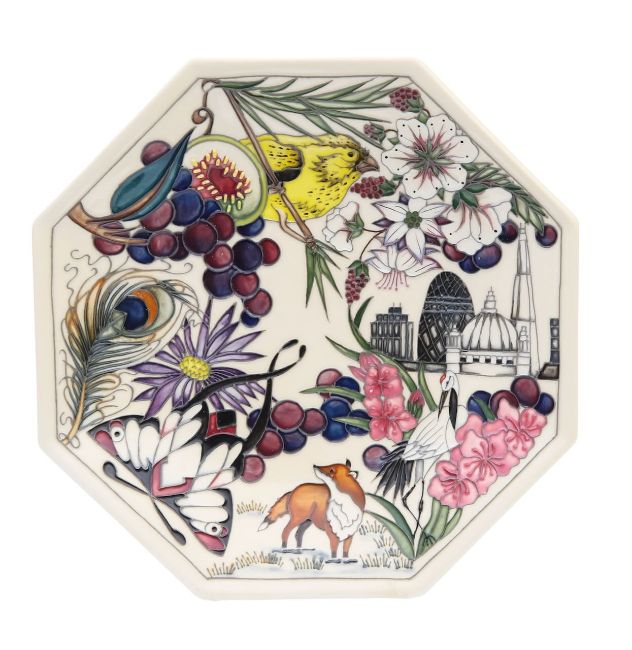 of octagonal form, depicting a bird amongst flowers and fruiting vines, above a London skyline, butterfly, fox and crane, signed by multiple artists, including Emma Bossons, Rachel Bishop, Anji Davenport, Vicky Lovatt, Nicola Slaney, Kerry Goodwin, Paul Hildtich, Elise Adams and Helen Dale, impressed marks, limited edition 4/50, dated 2017
