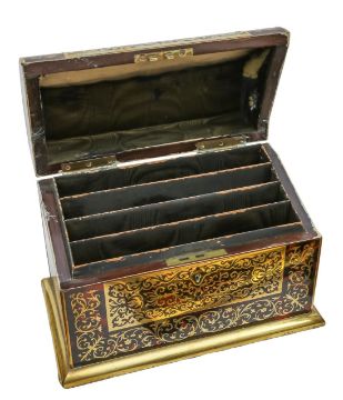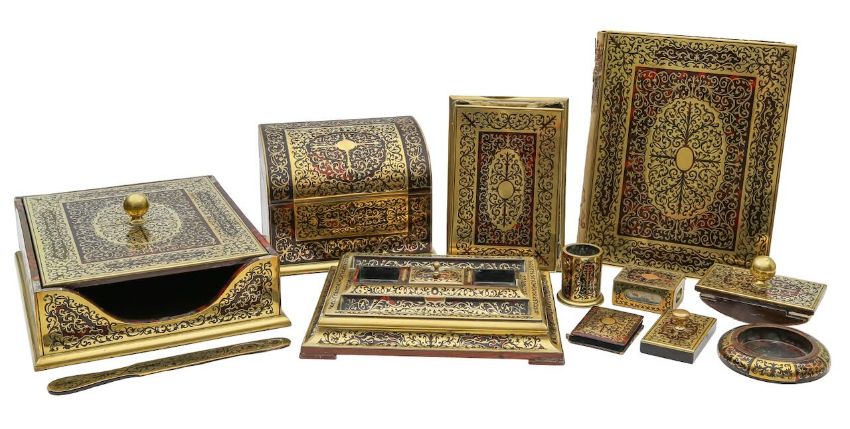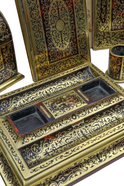 An Edwardian eleven piece boullework desk set,cut brass mounted and tortoiseshell veneered, comprising a desk tray and cover, a Moroccan leather lined folder, a similar smaller album, a rosewood rocker blotter, a desk tray, a letter casket, a needle book, a Moroccan leather lined paperweight, a stationary pot, an ashtray, and a matchbox case (11)the desk tray width 36cm, depth 28cm, height 15cmCondition: The leather is worn, particularly to the spines of the folders and books. The desk stand is missing one area of tortoiseshell. The desk tray is missing four areas of tortoiseshell. Small nibbles and losses to the tortoiseshell at the end of the page turner.