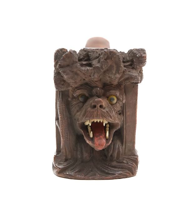 late 19th to early 20th century, modelled as a snarling dog, with yellow glass eyes, emerging from a kennel, with an amber and bone mouthpiece