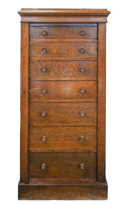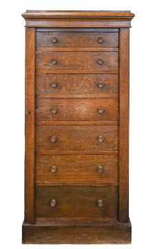 bearing 'Ofco, Vauxhall Bridge, London' label', of typical form, with bank of seven graduated drawers, hinged locking bar, plinth base