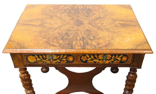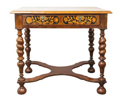 the quarter veneered top over a single marquetry floral inlaid drawer, raised on turned barley twist legs, united by an X-shape stretcher, terminating in ball feet