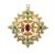 with later added pendant loop. centrally set oval ruby, surrounded by green pear shape gem stones and seed pearls to a closed back mount, brooch pin and 'C' clasp to the reverse