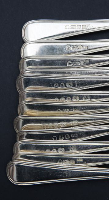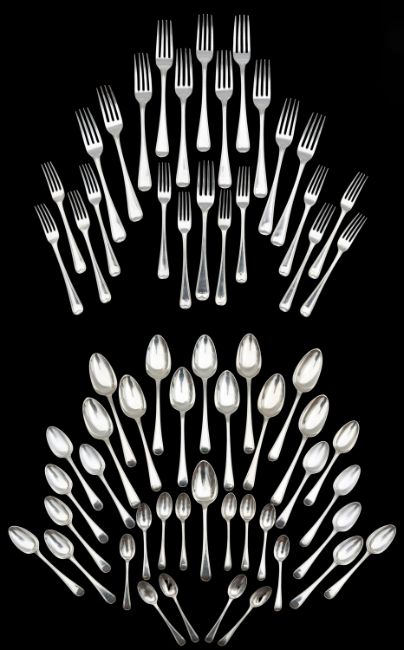 for twelve settings, comprising serving spoons, London 1823 and 1825, table forks, London 1787 and 1795, dessert spoons, London 1823, dessert forks, London 1813 and 1823, and teaspoons, London 1801 and 1809 (60)