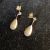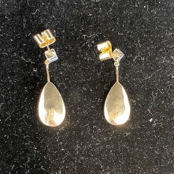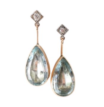 featuring an impassive 1.7cm drop of aquamarine in a bezel setting with a closed back stamp 9ct, suspended from a knife edge bar, old cut diamond grain set to a square mount, peg and scroll fitting