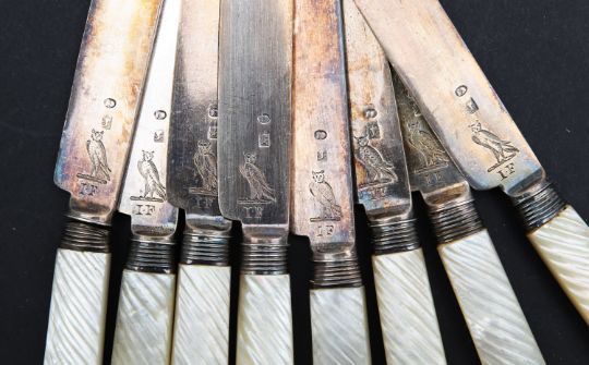 comprising ten knives and three forks, with engraved owl crests above initials 'IF' (13)