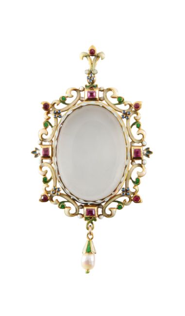 late 19th century, with large oval rock crystal compartment surrounded by enamelled scroll frame with stepped square cut rubies at the cardinal points and collet set rubies set in between, and accents of blue enamel flower heads and green enamel leaves, surmounted by a enamelled loop, suspending a 4.6mm pearl drop, the reverse engraved with maker's mark of a sunflower and CC, in fitted retailers box