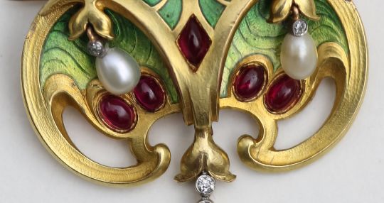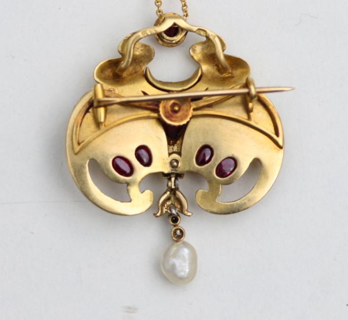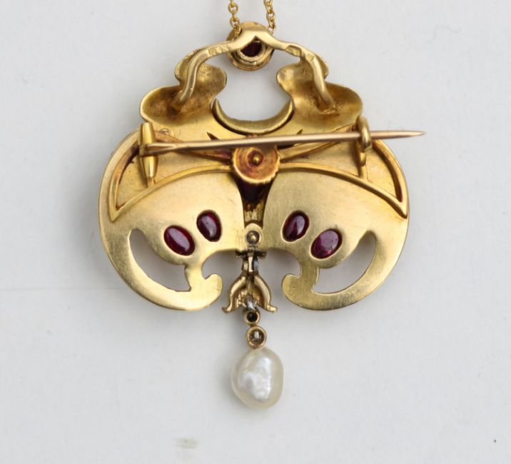 A Secessionist pearl, diamond, ruby and enamel pendant brooch