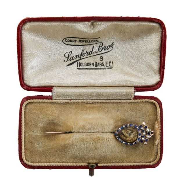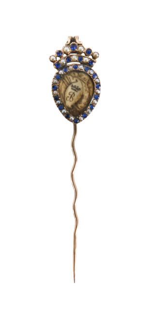 shield shaped enclosing an ivory plaque engraved with initial B, set with alternating sapphires and seed pearls surmounted by a coronet, contained within a fitted case