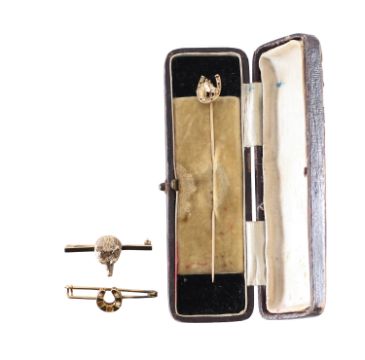 with 9ct hallmark, fox head bar brooch with ruby eyes, 9ct hallmark, horse head in horse shoe pin and a horse shoe set with seed pearls brooch (3)