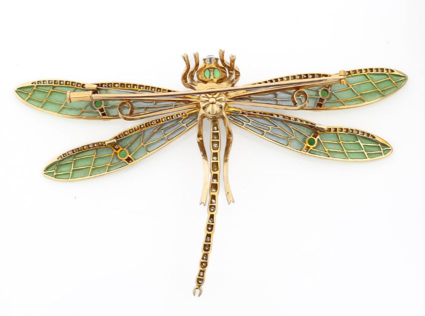 the four graduating eau de Nile plique à jour outstretched wings with diamond-set edges, each applied with a demantoid garnet collets, the segmented body set with old-cut diamonds, green garnet eyes and old-cut diamond mouth