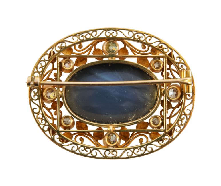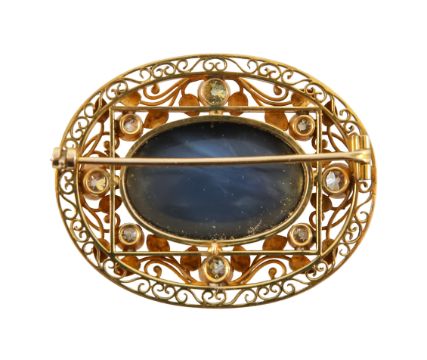 A black opal and diamond-set broochearly 20th century, the central oval black opal collet measuring 2.7cm x 1.8cm to the openwork scrolling and foliate yellow gold surround set with eight old brilliant-cut diamonds (including one of a greeny-yellow hue, untested for natural colour) Dimensions: width 4.4cm, height 3.5cm, 15.4gThe opal is a doublet