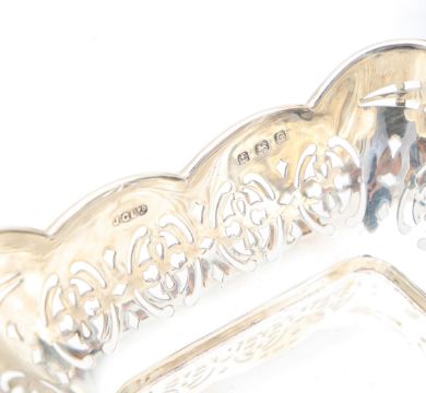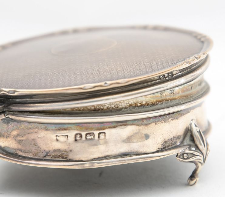 the dressing table box of circular form, Birmingham 1942, with engine-turned decorated, raised on four Art Nouveau style feet, the four pierced dishes by Joseph Gloster Ltd, Birmingham 1927, of rectangular form, with a scalloped edge (5)