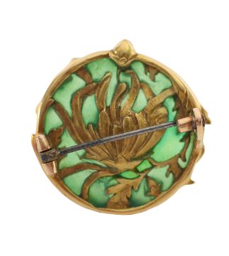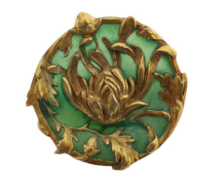 the green enamel brooch with gold relief decoration of stylized flowers and foliage decoration to the surrounds, with Poincon mark to clasp