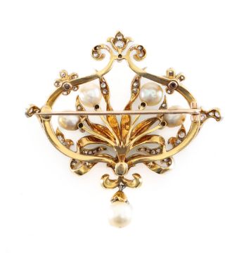 An Art Nouveau natural pearl, diamond and enamel brooch