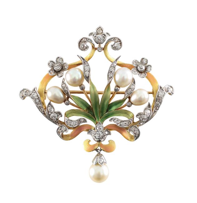 of foliate design, with variegated green leaves to centre twisting to the ends and set with old cut diamonds, each leaf interspersed with natural pearls, with pink enamel border to edge set with diamond scrolls, leaves and flower heads, terminating in a natural pearl drop, accompanied by report no 03154 dated 7 September 2010 from the Gem Pearl Laboratory stating that the pearls are Natural Saltwater